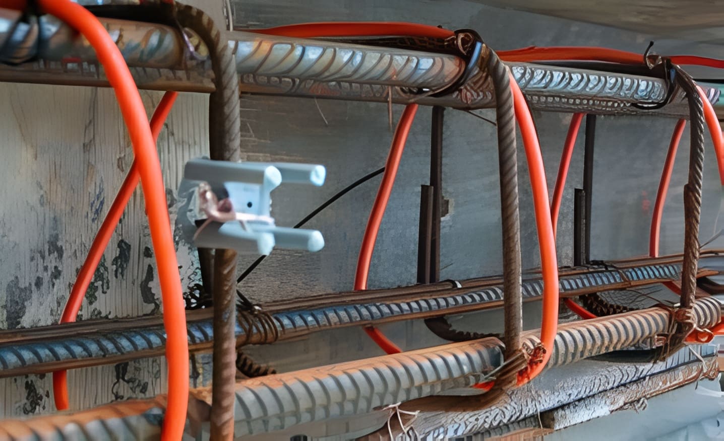 Монтаж греющего провода выполняется до начала бетонирования. Кабель укладывается на арматурный каркас и фиксируется пластиковыми хомутами или проволокой. Важно правильно распределить провод по всей площади конструкции для равномерного прогрева бетона.