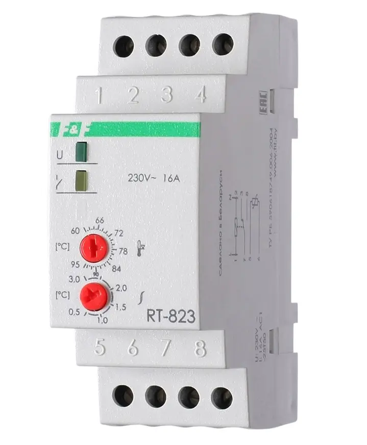RT-823 – электронный терморегулятор для установки в щиток на профиль DIN с диапазоном регулирования температуры от +60 до +95 °C. Поставляется в комплекте с датчиком.
