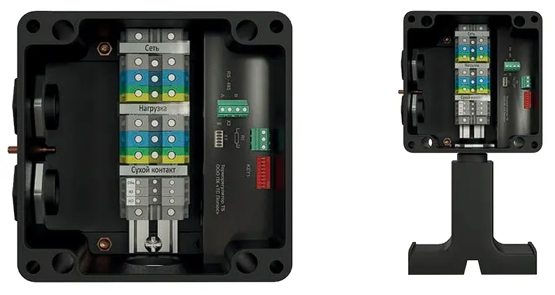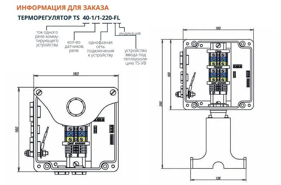 В терморегуляторе TS реализован перекидной «сухой» контакт рассчитанный на номинальный ток 6А при напряжении 220В. Применяемые клеммные наборы позволяют выполнить подключение многожильных или одножильных кабелей сечением от 0,5 до 10 мм². В зависимости от исполнения терморегулятор TS устанавливается, на обогреваемый трубопровод при помощи кронштейна, или на близлежащую металлоконструкцию, либо при исполнении (-F) устанавливается на обогреваемый объект.