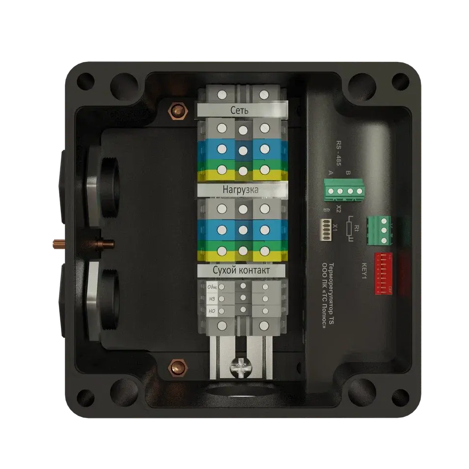 Программируемый взрывозащищенный терморегулятор TS предназначен для поддержания заданной температуры на обогреваемом объекте посредством включения и отключения питания греющего кабеля (нагрузки). В качестве нагрузки, к терморегулятору TS, возможно подключить саморегулирующиеся нагревательные секции марок TSA, TSL, TSS и TSU, или нагревательные кабели марок RTSL и RTS, либо иную нагрузку не превышающая допустимые параметры терморегулятора TS. Измерение температуры с поверхности обогреваемого объекта осуществляется посредством трёхпроводного взрывозащищённого (Ex i) термосопротивления (датчика температуры), передача температурных данных в АСУ ТП заказчика осуществляется по протоколу ModBus RTU.