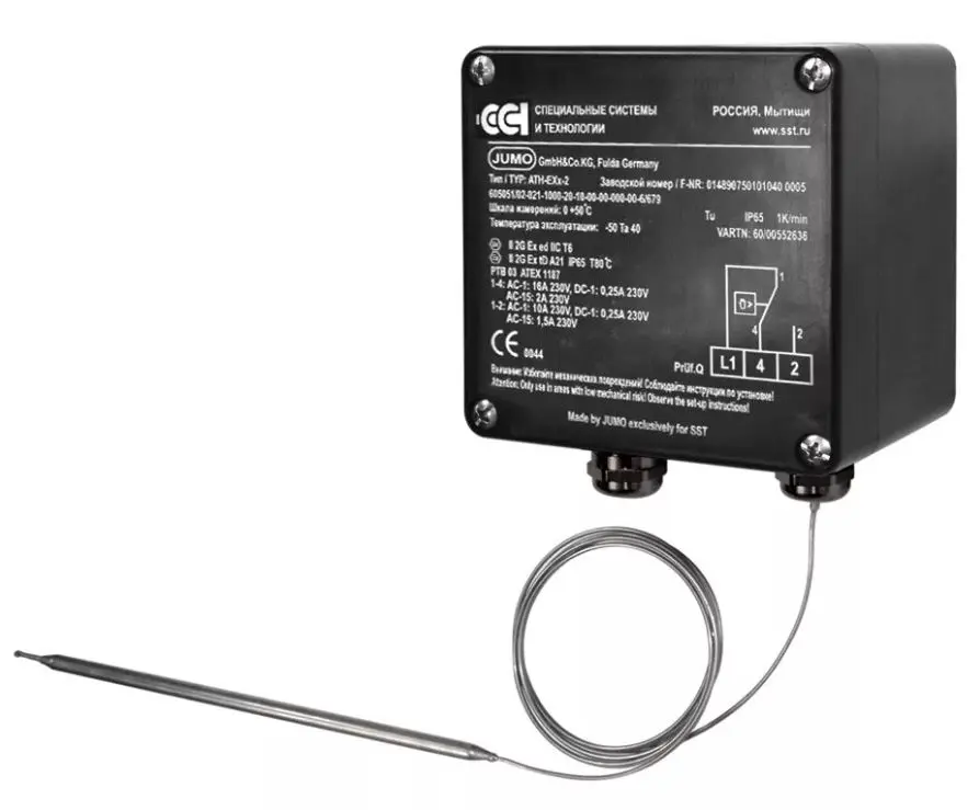 Термостат представляет собой реле температуры и работает по принципу расширения газа или жидкости. Переключения перекидного контакта реле устройства осуществляются в пределах гистерезиса относительно установленной температуры поддержания. Электрическим переключающим устройством служит микровыключатель (без дополнительного источника питания), расположенный внутри огнеупорного корпуса. Допускается вводить в термостат бронированные кабели с уплотнением по оболочке поверх брони.