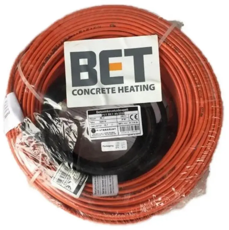Нагревательные кабели PISTESARJAT BET предназначены для специального применения. Эти кабели применяют для кратковременного одноразового использования в зимний период для ускорения созревания бетона. Установка и использование нагревательных кабелей возможна в температурах до -10 °C. После того, как бетон затвердеет, кабели отсоединяются (отрезаются) и остаются в бетонном блоке. Кабели предназначены исключительно для промышленного использования и производятся в соответствии с IEC 60800. Нагревательный контур (IP 67) заканчивается холодным концом длиной 2 м с розеткой (IP 20), подключается к напряжению 230 В. Диаметр нагревательного кабеля 7 мм.