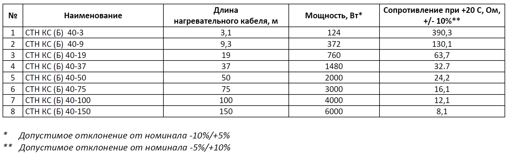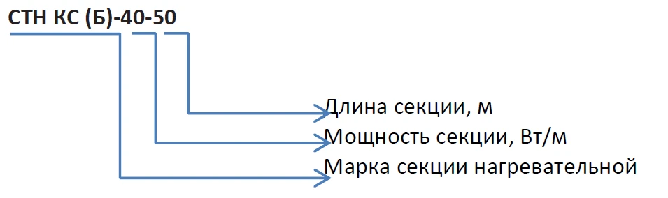 Кабель КС (Б) состоит из металлических нагревательных жил в полимерной изоляции, соединительной и концевой муфт и силовым проводом для подключения к источнику тока. Секции СТН соответствуют требованиям технического регламента таможенного союза «О безопасности низковольтного оборудования» ТР ТС 004/2011. ТУ 3443-008-92573011-2017. Длина кабельной секции составляет 100 м.