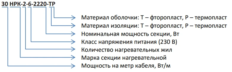 Секция 30 НРК 2-6-480-ТР состоит из двухжильного нагревательного кабеля постоянного сопротивления (резистивного типа) определенной фиксированной длины, с одной стороны которого установлена концевая муфта, а с другой — соединительная муфта, с помощью которой нагревательный кабель соединяется с кабелем питания длиной 4 метра. Внутренняя изоляция из фторопласта обеспечивает высокую стойкость к высоким температурам, агрессивным средам, а также защищает кабель от перегрева, продлевая срок его эксплуатации. Армирующая нить придает кабелю дополнительную механическую прочность, защищая его от возможных повреждений при укладке. А усиленная оболочка с повышенной термостойкостью защищает кабель от воздействия УФ-лучей и внешних механических воздействий, гарантируя его долговечность. Срок службы секции НРК-ТР составляет не менее 25 лет.