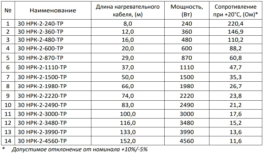 Параметры стандартных секций нагревательных НРК-ТР на рабочее напряжение 230 В.