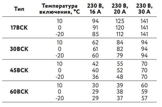 Максимальная длина нагревательной секции нагревательного кабеля ССТ ВСК рассчитывается, исходя из температуры включения и типа автоматического выключателя питания: