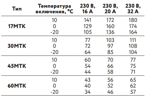 Максимальная длина нагревательной секции нагревательного кабеля ССТ МТК рассчитывается, исходя из температуры включения и типа автоматического выключателя питания: