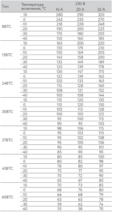 Максимальная длина нагревательной секции нагревательного кабеля ССТ ВТС рассчитывается, исходя из температуры включения и типа автоматического выключателя питания: