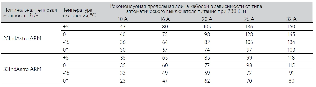 Максимальная длина нагревательной секции нагревательного кабеля ССТ IndAstro ARM рассчитывается, исходя из температуры включения и типа автоматического выключателя питания:
