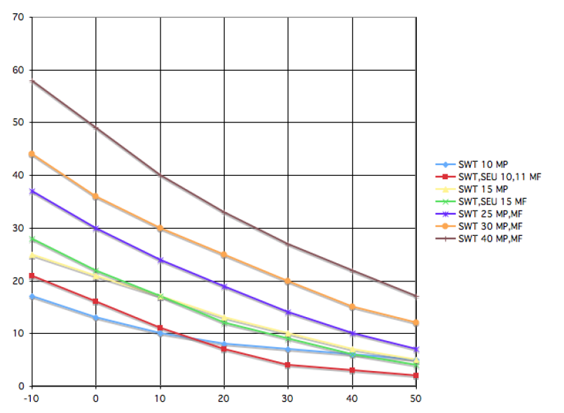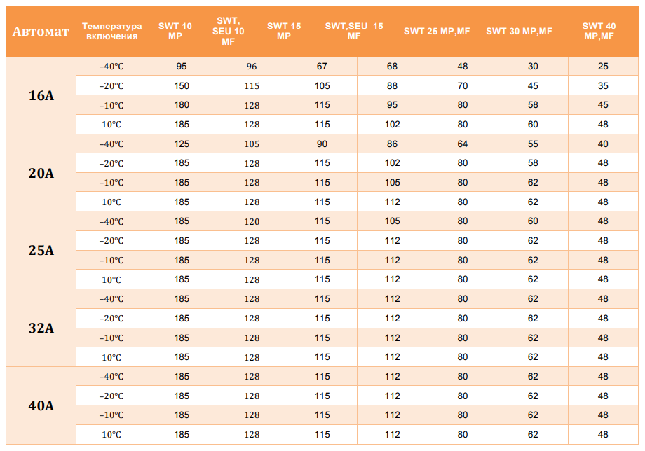 Максимальная длина нагревательной секции нагревательного кабеля SHTEIN SWT рассчитывается, исходя из температуры включения и типа автоматического выключателя питания: