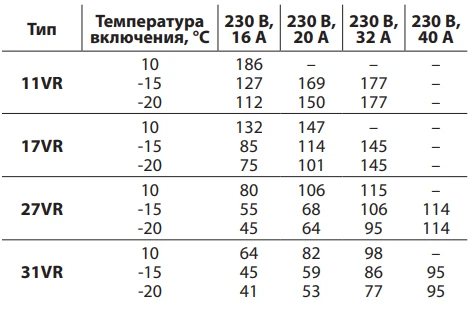 Максимальная длина нагревательной секции нагревательного кабеля Теплолюкс VR рассчитывается, исходя из температуры включения и типа автоматического выключателя питания:.webp)