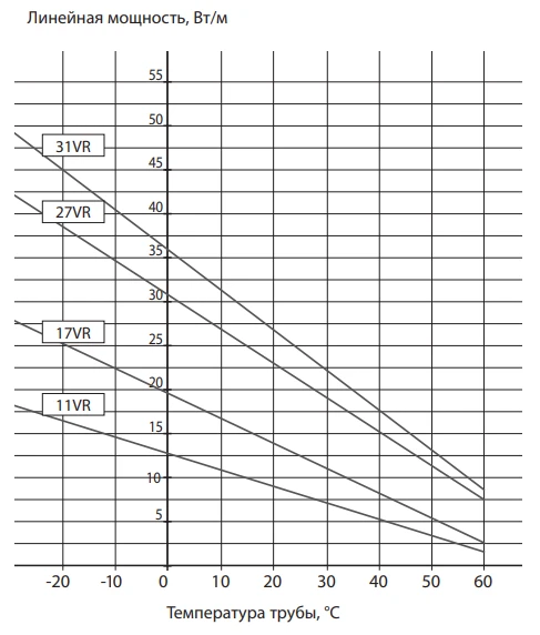 Номинальное тепловыделение в нормированных условиях для саморегулирующихся нагревательных кабелей Теплолюкс VR с рабочим напряжением 230В:.webp)