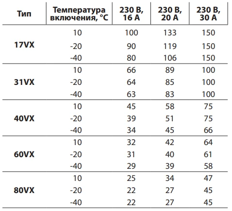 Максимальная длина нагревательной секции нагревательного кабеля Теплолюкс VX рассчитывается, исходя из температуры включения и типа автоматического выключателя питания: