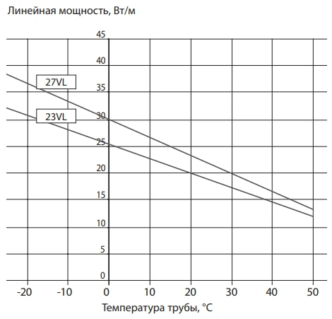 Номинальное тепловыделение в нормированных условиях для саморегулирующихся нагревательных кабелей Теплолюкс VL с рабочим напряжением 230В: