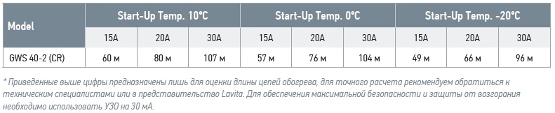 Максимальная длина нагревательной секции нагревательного кабеля LAVITA GWS рассчитывается, исходя из температуры включения и типа автоматического выключателя питания.