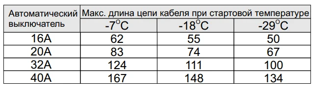 Максимальная длина нагревательной секции нагревательного кабеля SLT рассчитывается, исходя из температуры включения и типа автоматического выключателя питания: