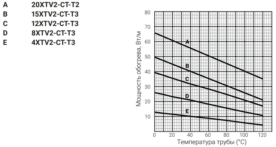 Номинальная мощность обогрева при напряжении 230 В на теплоизолированных стальных трубах.